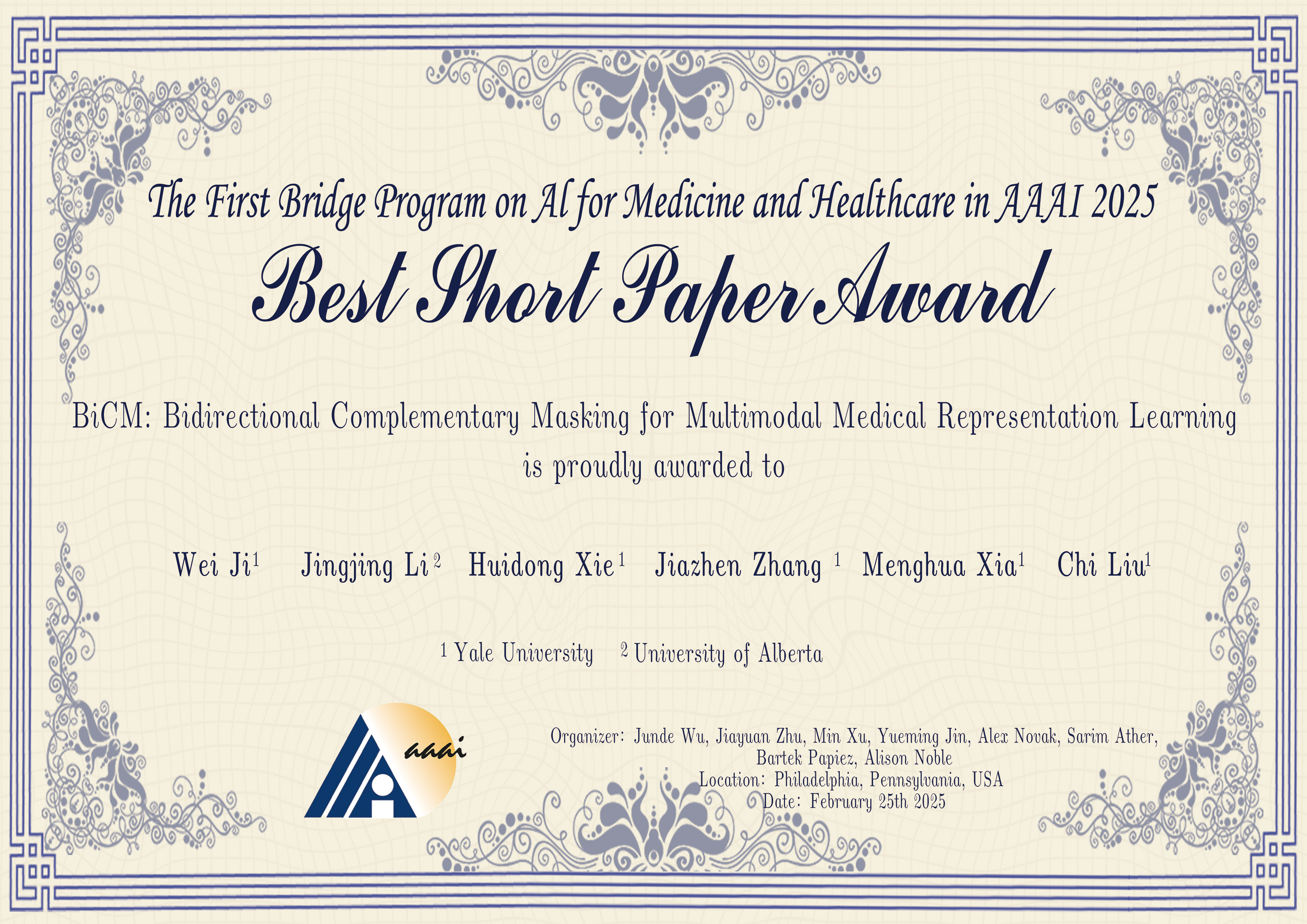 [Jan, 2025] One paper accepted at AAAI 2025 bridge: AI for Medicine and Healthcare and won the Best Short Paper Award.
